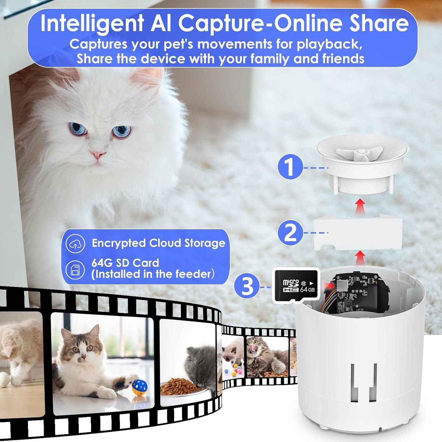 - Almacenamiento en la nube + tarjeta SD: el alimentador automático para gatos puede compartir el acceso a la aplicación con familiares o amigos (5 personas), y el alimentador automático para gatos con cámara almacena datos en la tarjeta SD y almacenamiento en la nube (tarjeta SD de 64 GB, el almacenamiento en la nube es gratuito durante los primeros 30 días), y puedes compartir fotos o videos con tu familia o amigos. El comedero cronometrado para gatos es perfecto para familias ocupadas, proporcionando flexibilidad y asegurando que todos se mantengan conectados con tu mascota.