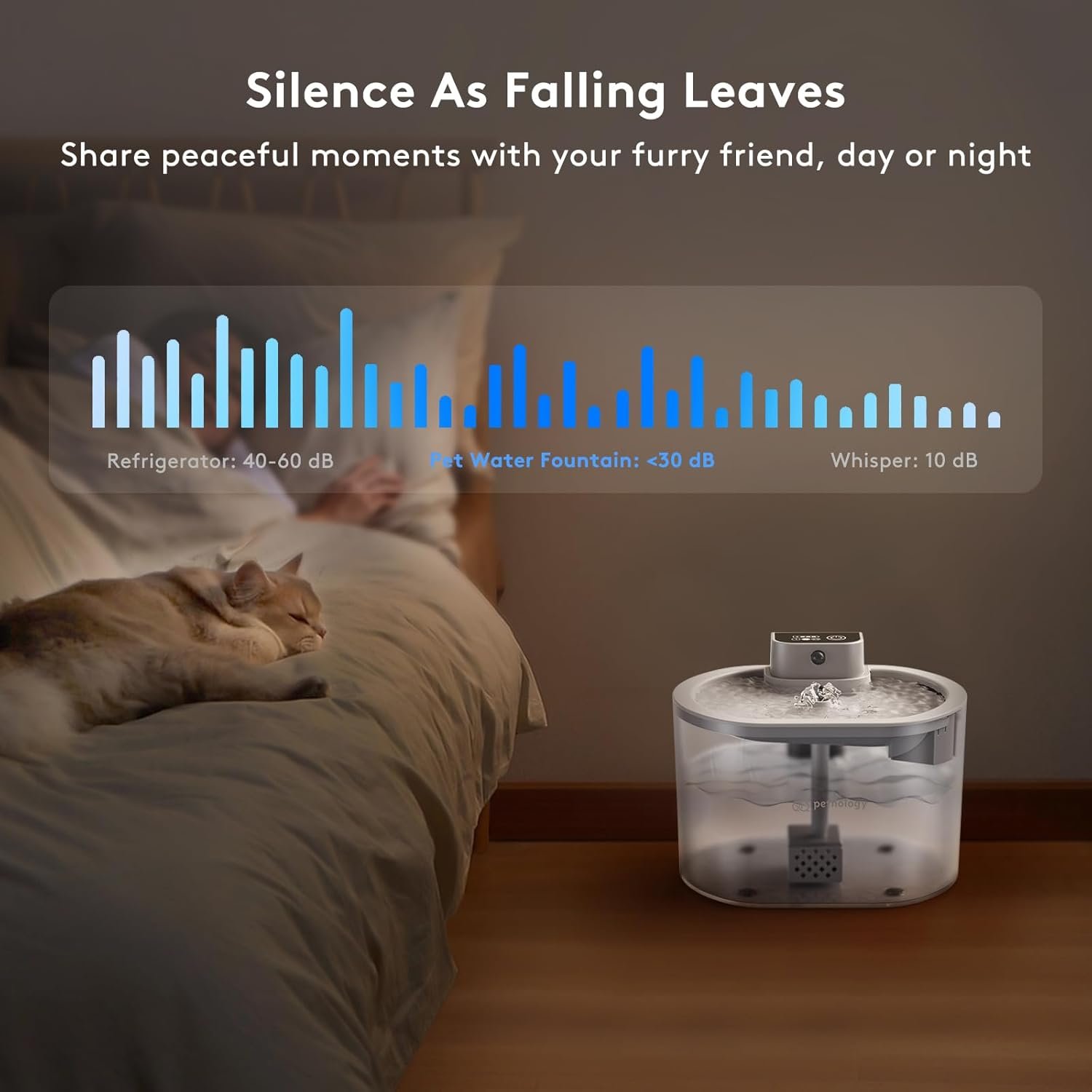 - Bomba ultrasilenciosa de 5 V: diseñada para la tranquilidad, esta fuente de agua para gatos funciona con baterías funciona con una bomba de 5 V con niveles de ruido tan bajos como ≤28 dB, para que tu mascota pueda beber en paz. Para un mejor rendimiento, limpie la fuente y la bomba regularmente, y reemplace el filtro cada 30 días. (Filtros de repuesto no incluidos. Busca «B0DK74D5ZS» en Amazon para comprar)