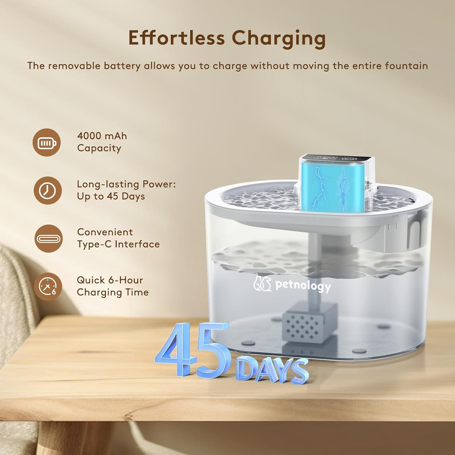 - Duración de la batería extendida: con una batería recargable incorporada de 4200 mAh, esta fuente de agua inalámbrica para gatos mantiene a tu mascota hidratada hasta 45 días con una sola carga. Incluso si la energía se apaga, su gato seguirá teniendo agua fresca.