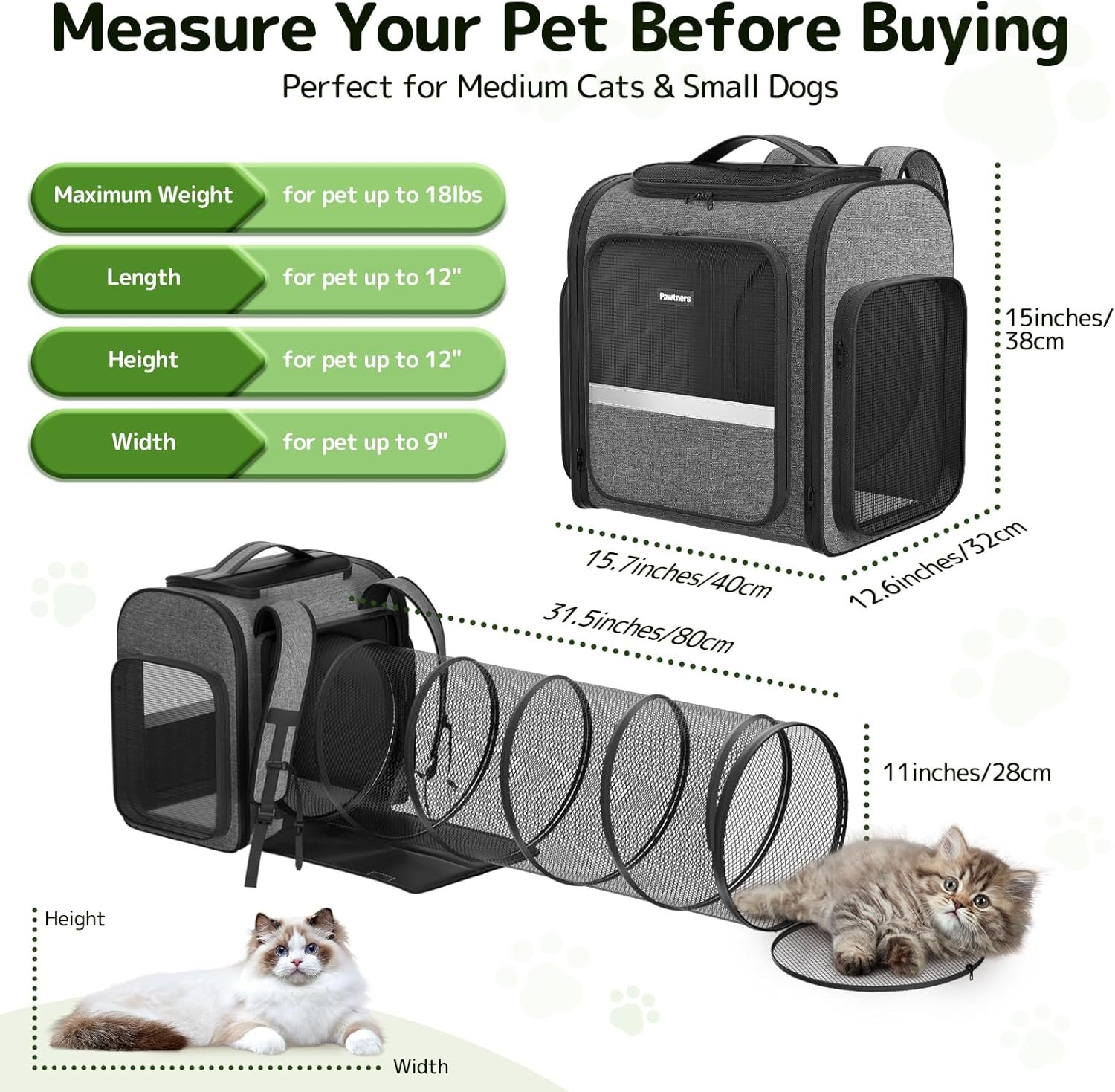 • Diseño de túnel expandible: esta mochila grande para mascotas (43 pulgadas de largo x 12.6 pulgadas de ancho x 15 pulgadas de alto) cuenta con un diseño de túnel de malla expandible y transpirable (31 pulgadas de largo x 11 pulgadas de ancho x 11 pulgadas de alto). El diseño expandible ofrece a tu mascota más espacio para jugar, descansar y mejorar la circulación del aire, promoviendo su comodidad y reduciendo la ansiedad. Cuando no está en uso, el diseño plegable ayuda a ahorrar espacio de manera eficiente. Por favor, no seleccione un transportador basado únicamente en el peso de su mascota. Para un mejor ajuste y comodidad, asegúrate de medir la longitud y la altura de tu mascota y compararlas con las dimensiones del transportador