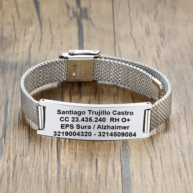 Una manilla elegante, resistente y funcional para llevar tu información esencial siempre contigo. Fabricada en acero inoxidable con diseño tipo malla y acabado premium, cuenta con broche de seguridad ajustable para un ajuste cómodo y firme durante todo el día.